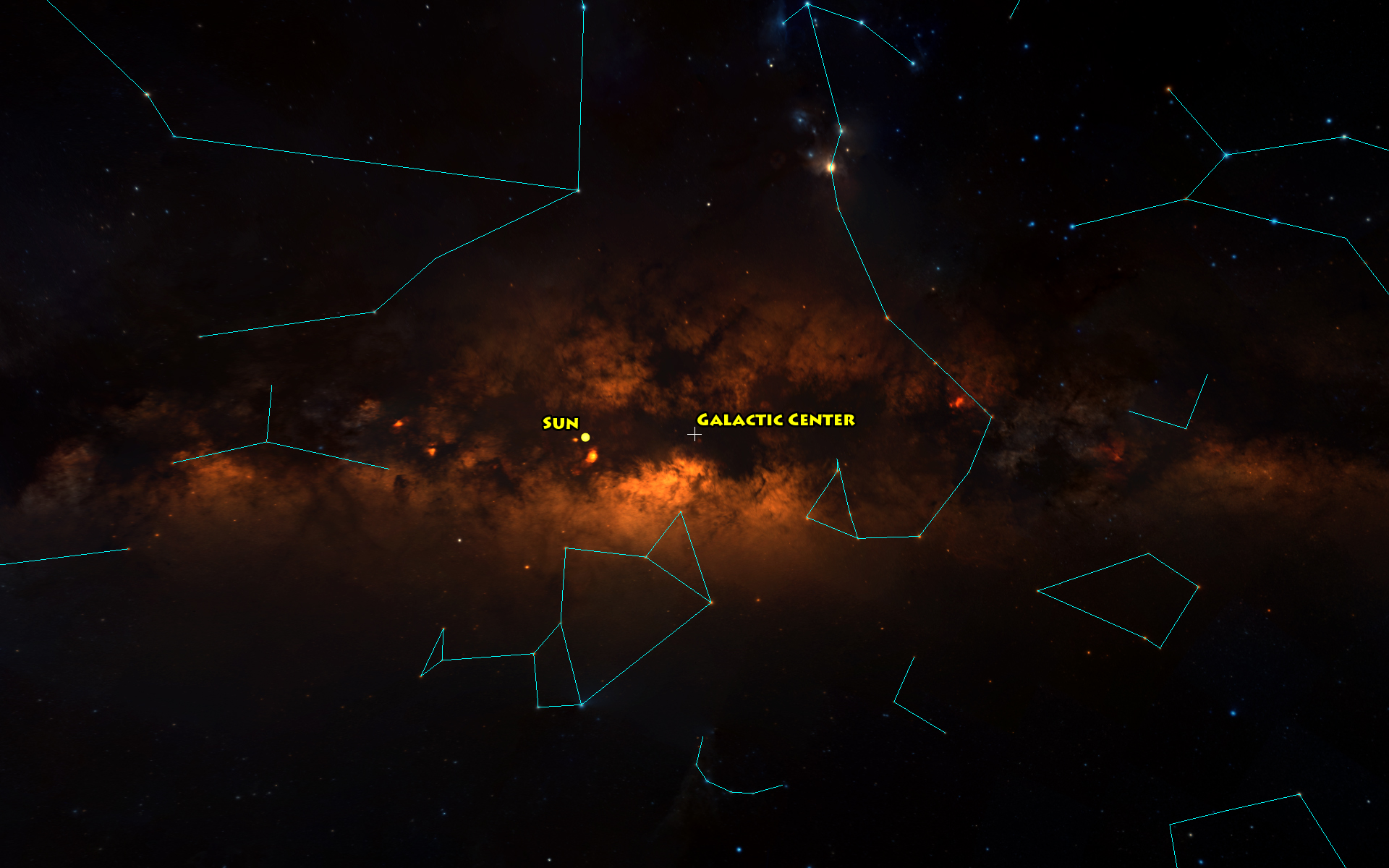 A view of the sky seen in visible light from the Digitized Sky Survey. The Sun’s position on December 21st, 2012 is plotted. This cannot be directly observed on this date since the Sun’s brightness lights up the sky making it much brighter than the stars. (Image credit: Bryan Mendez, UC Berkeley/World Wide Telescope)