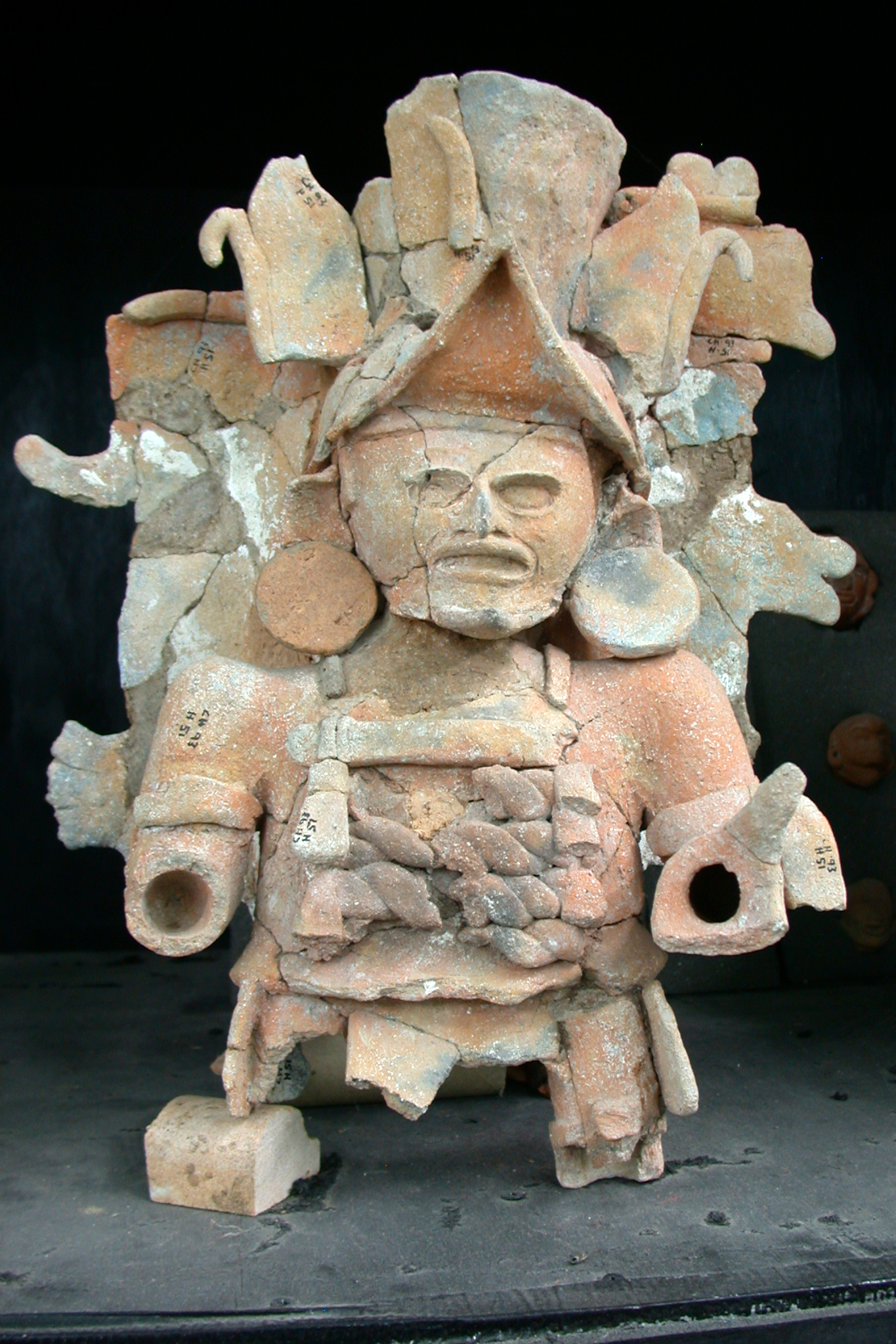 This censer, or incense burner is in the Molded Chenmul style, and corresponds to the post-classic period (1200-1500 C.E.). It is a molded mud vessel displaying a richly decorated individual. The upper posterior section of this poly-chromed ...