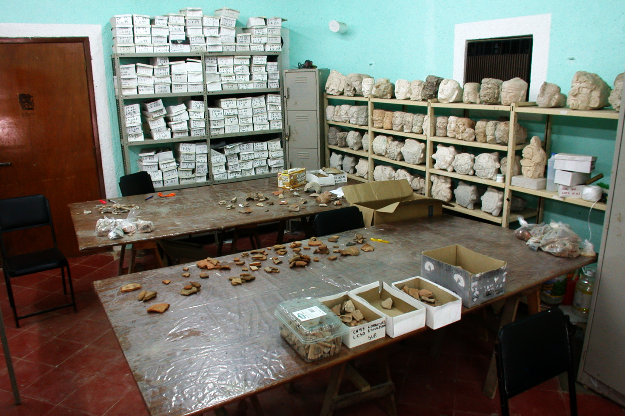 Stone heads and figures displayed on shelves at the INAH offices. Pottery chards are catalogued and stored in marked boxes; some are visible on the table tops where they are studied and sorted. (Image Credit: David Williamson, Ideum)