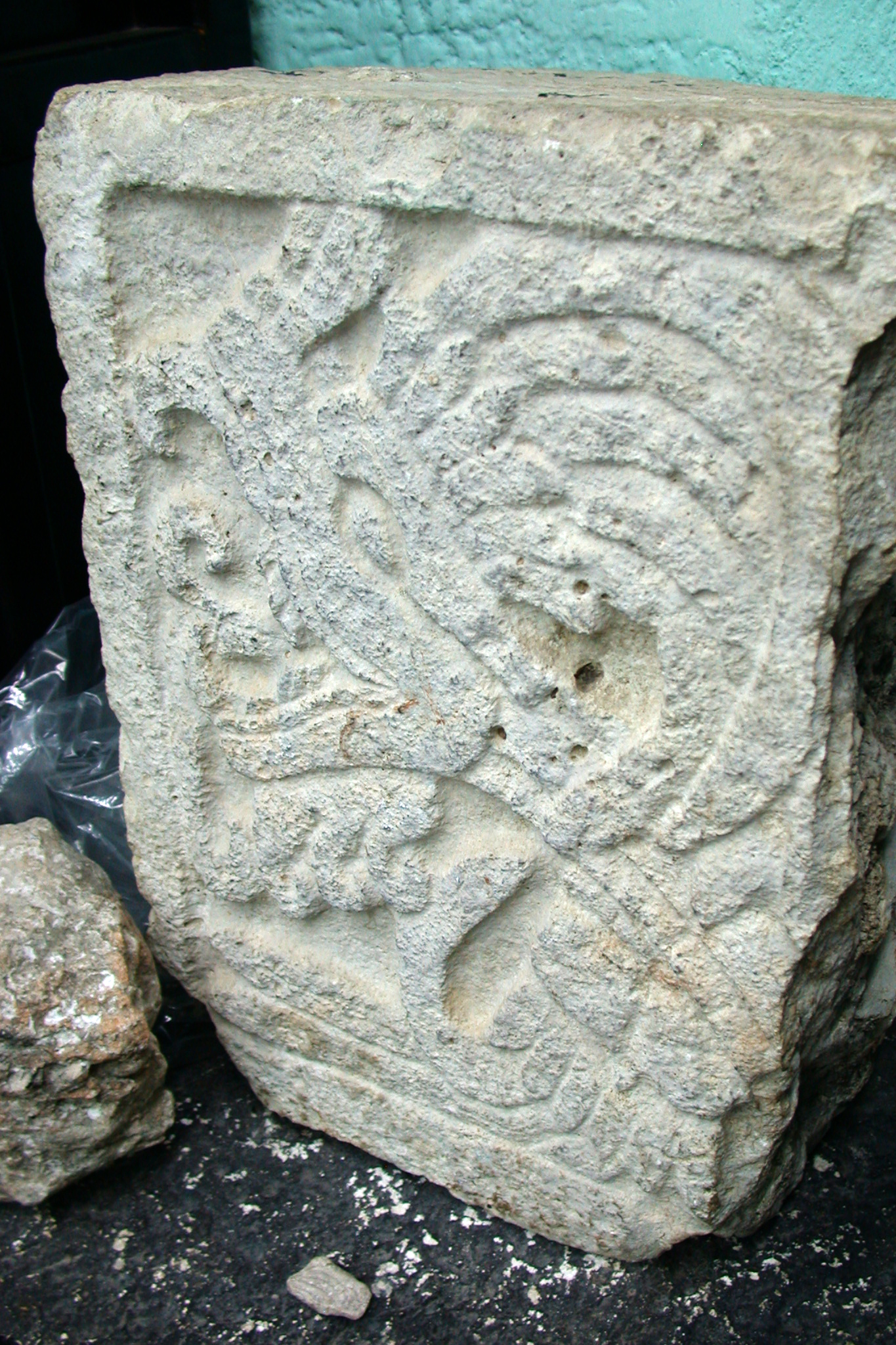 This corner stone formed part of a relief that framed the upper decorative elements in the Temple of the Jaguars. This relief shows the profile of a feathered serpent’s head, which is crowned with feathers and displays an open mouth with a ...